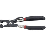 • Plier tips trap and hold the clamp, then swivel for multiple access angles